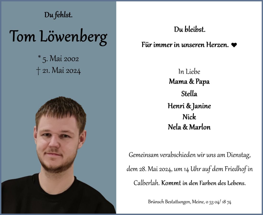 Wir: Karl-Gunther, Ann-Sophie und Kerstin sind in tiefer Trauer um Tom.